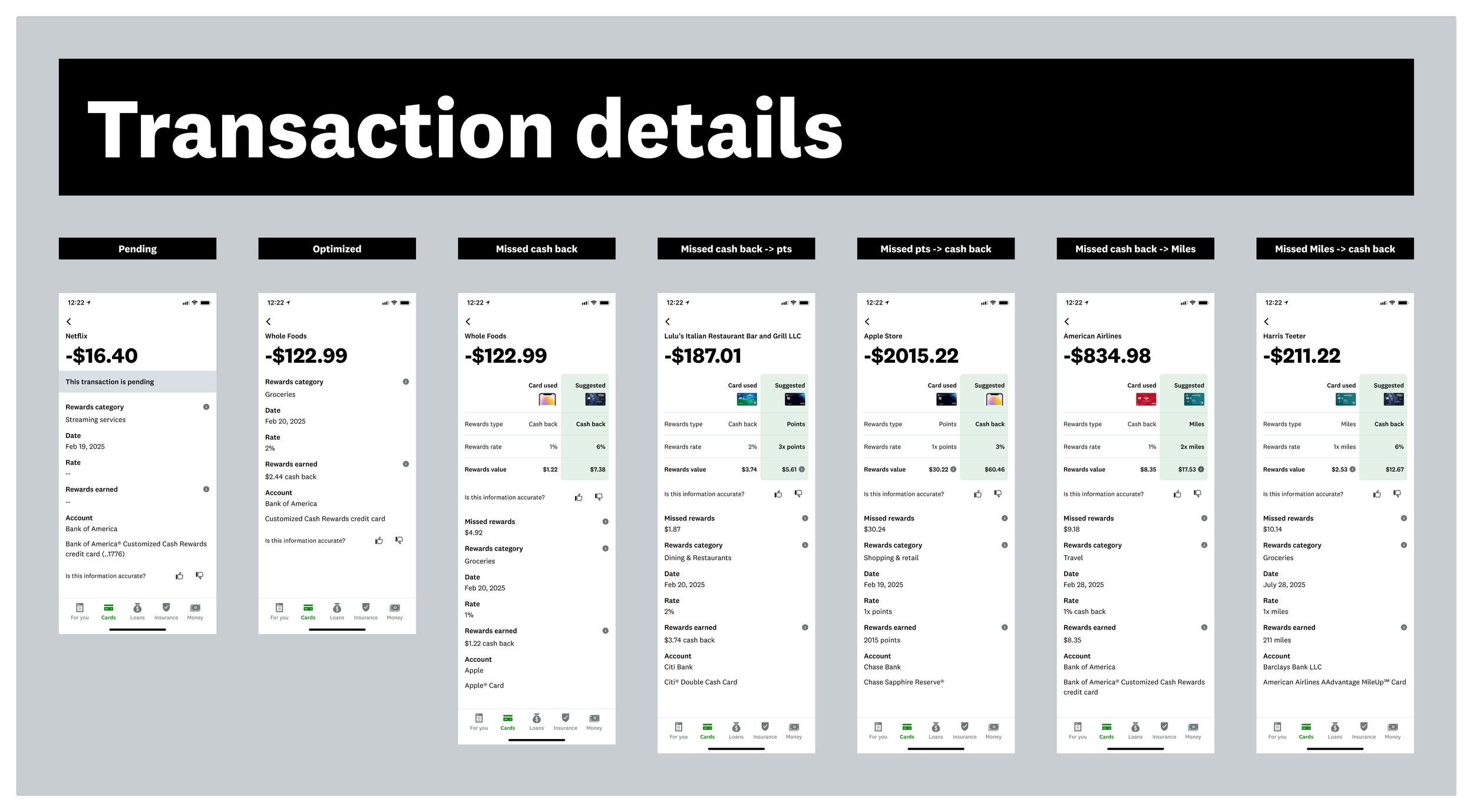 The “missed transactions” rows resonated the most with test participants, so our main goal was to refine the “Spend score” concept further to obtain the correct framing.